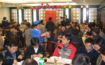 12月15日晚,主办方西安电子科技大学特意在坊上人饭庄电子步行街店设宴款待参赛选手和嘉宾,ACM/ICPC亚洲区竞赛组委会主席黄金雄教授、Sun全球副总裁王星耀先生、特派代表佟佳珏和来自中国科学院以及北京大学、清华大学等国内著名高等学府的众多知名专家、学者、教授出席了宴会。宴会在祥和而热烈的气氛中进行,来宾中有不少人是第一次来西安,更是第一次品尝如此富有地方风味特色的牛羊肉泡馍,显得非常兴奋,不时询问泡馍的掰法和来历与吃法。不少选手吃得大汗淋漓,纷纷称赞“坊上人”的泡馍口味纯正,名不虚传,有位参赛同学还风趣地说:“吃了这么香的羊肉泡,明天的比赛准能拿到好成绩”。