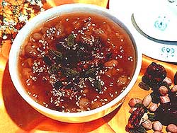 【原料】熟糯米、水、淀粉、白糖、红糖、葡萄干、蜜枣、百合、蕨麻、莲子、红枣、核桃仁等。